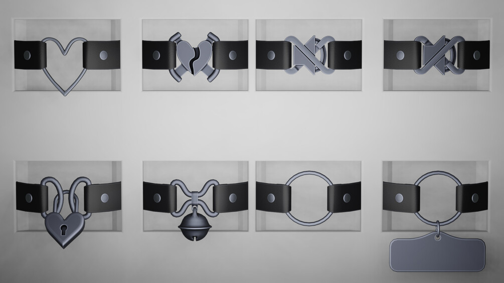 A Choker Set that has a lot of options meant for VRChat with Physbone in mind.